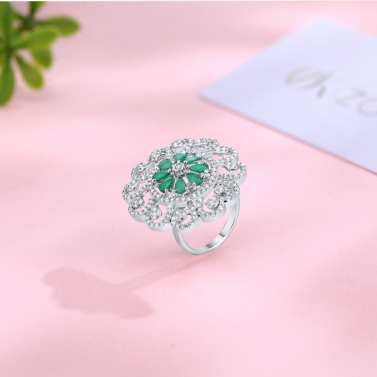 Let your style blossom with the Regal Ivy Ring, an enchanting blend of classic elegance and bold design. At the heart of this masterpiece lies a vivid green floral motif, crafted with pear-shaped stones arranged like ivy leaves spiraling around a sparkling diamond-studded core.
