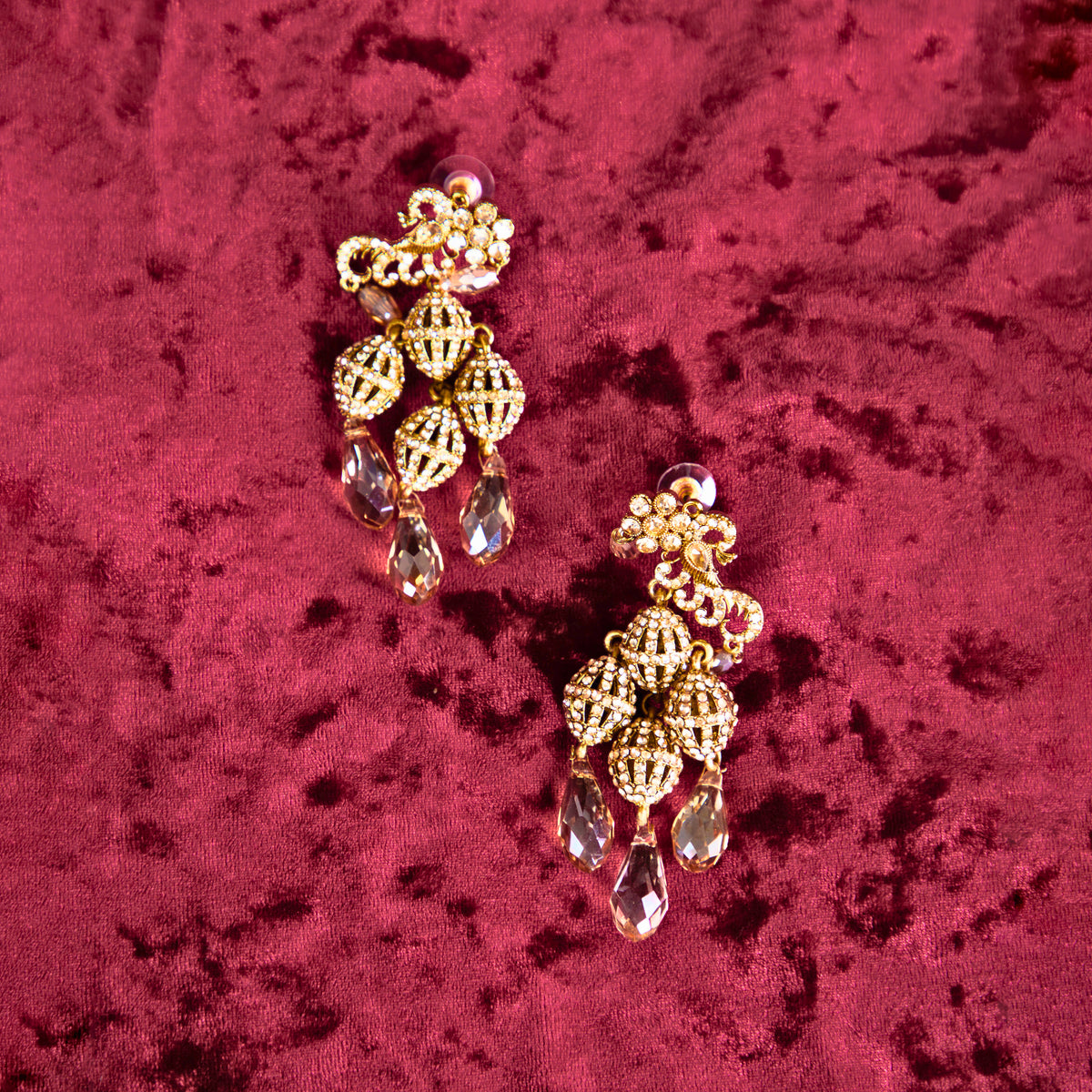 Design: Chandelier-style with filigree patterns and dangling teardrops
