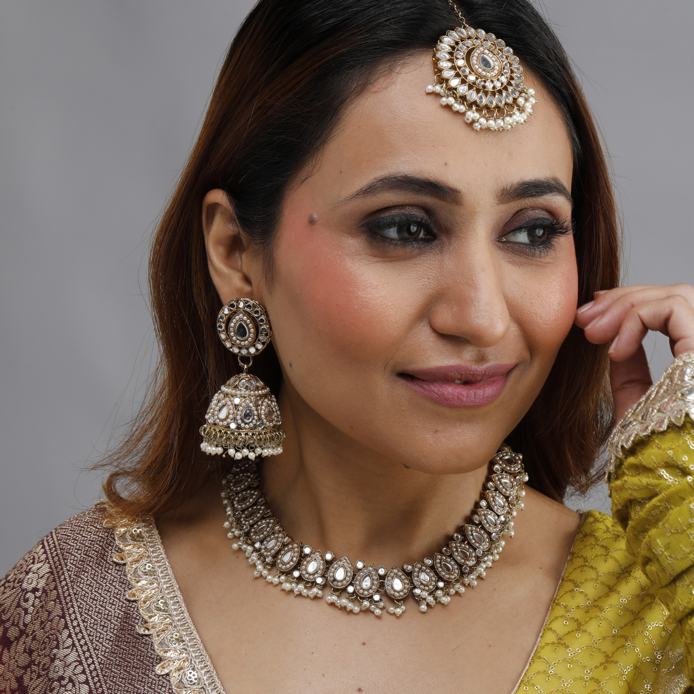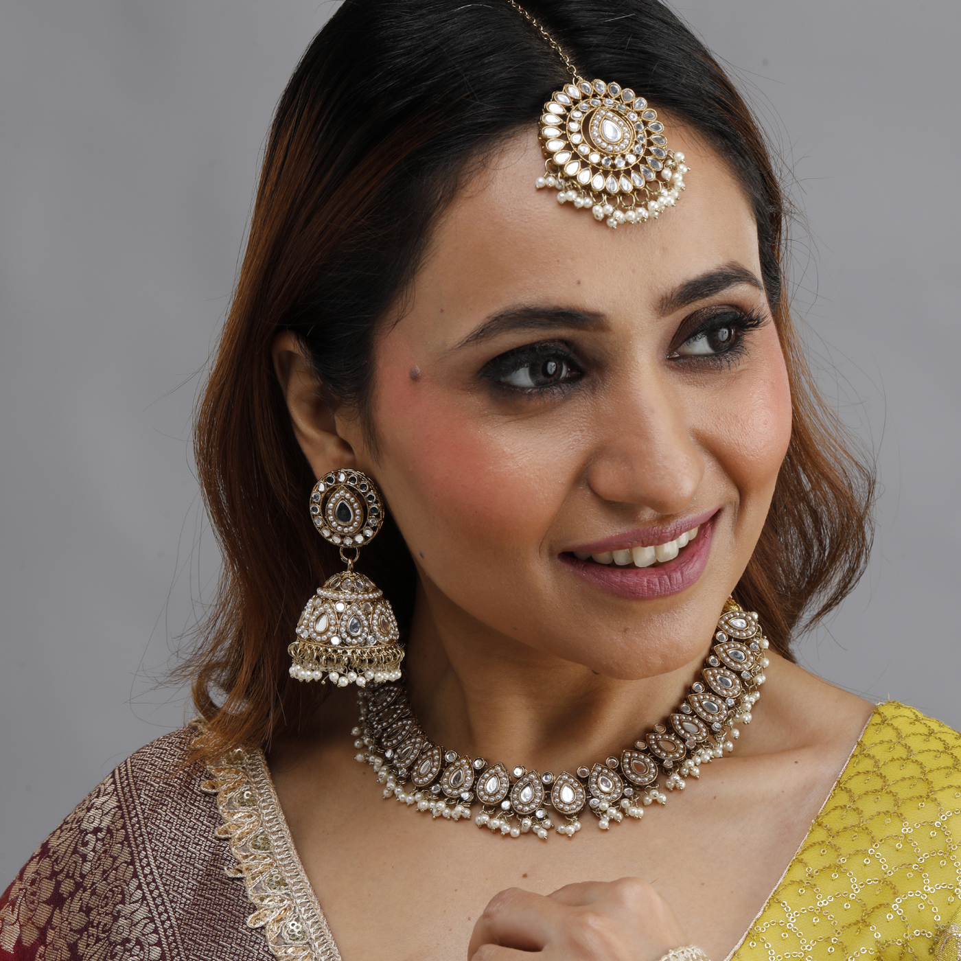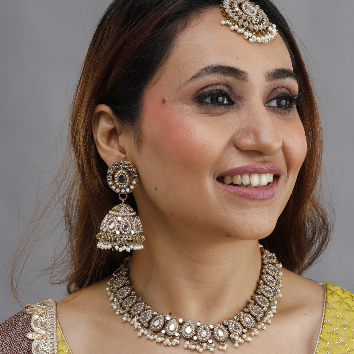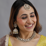Kundan Jewelry Set: Includes a statement necklace, Jhumka earrings, and a Maang Tikka. Finish Options: Available in Gold, Silver, and Multi-color variants.