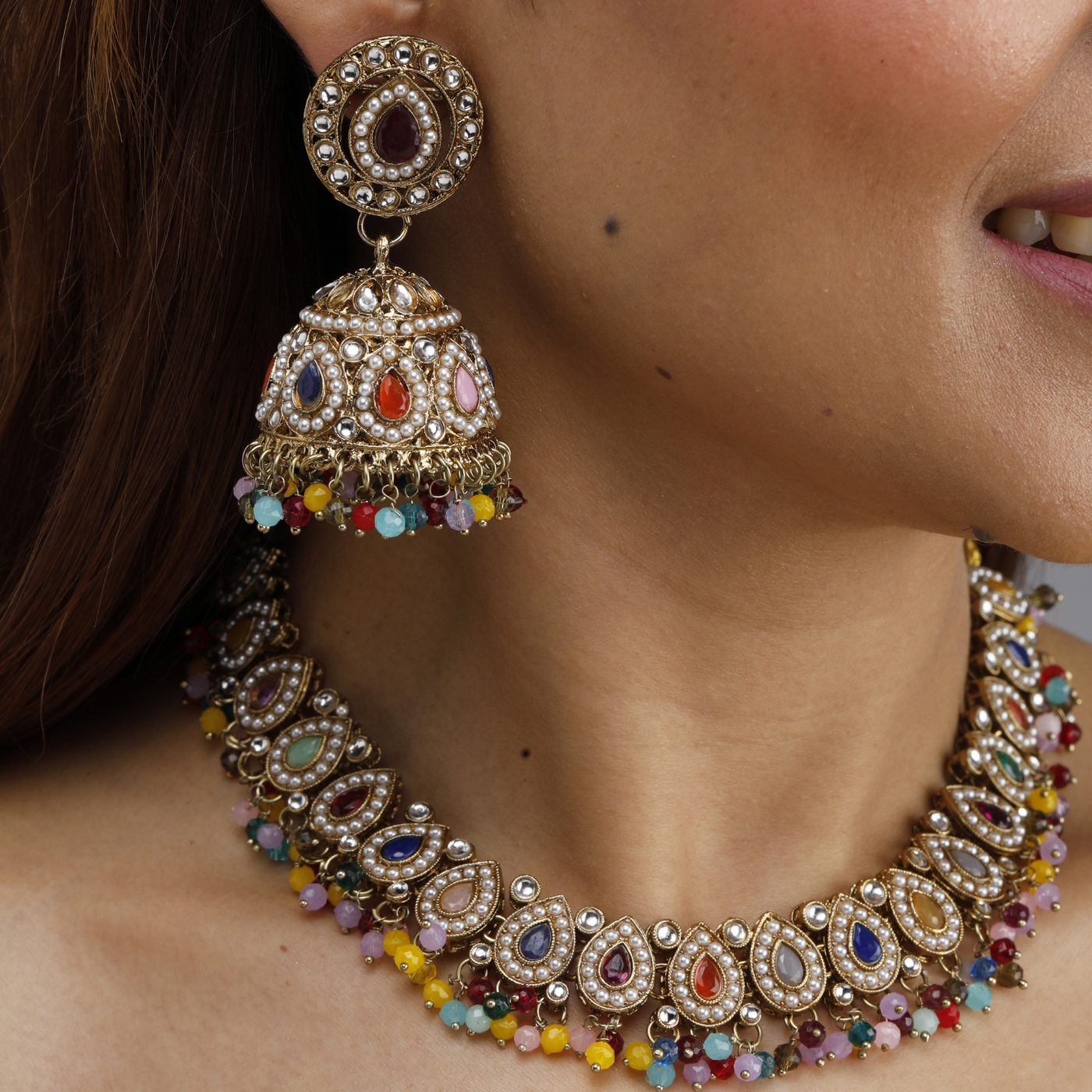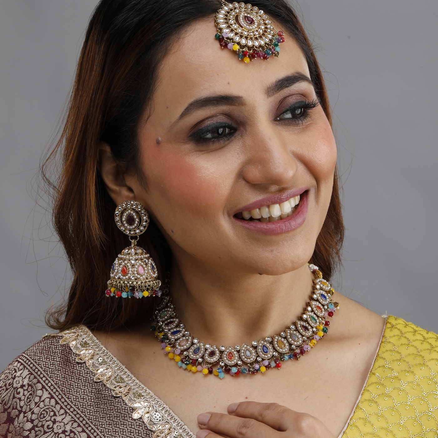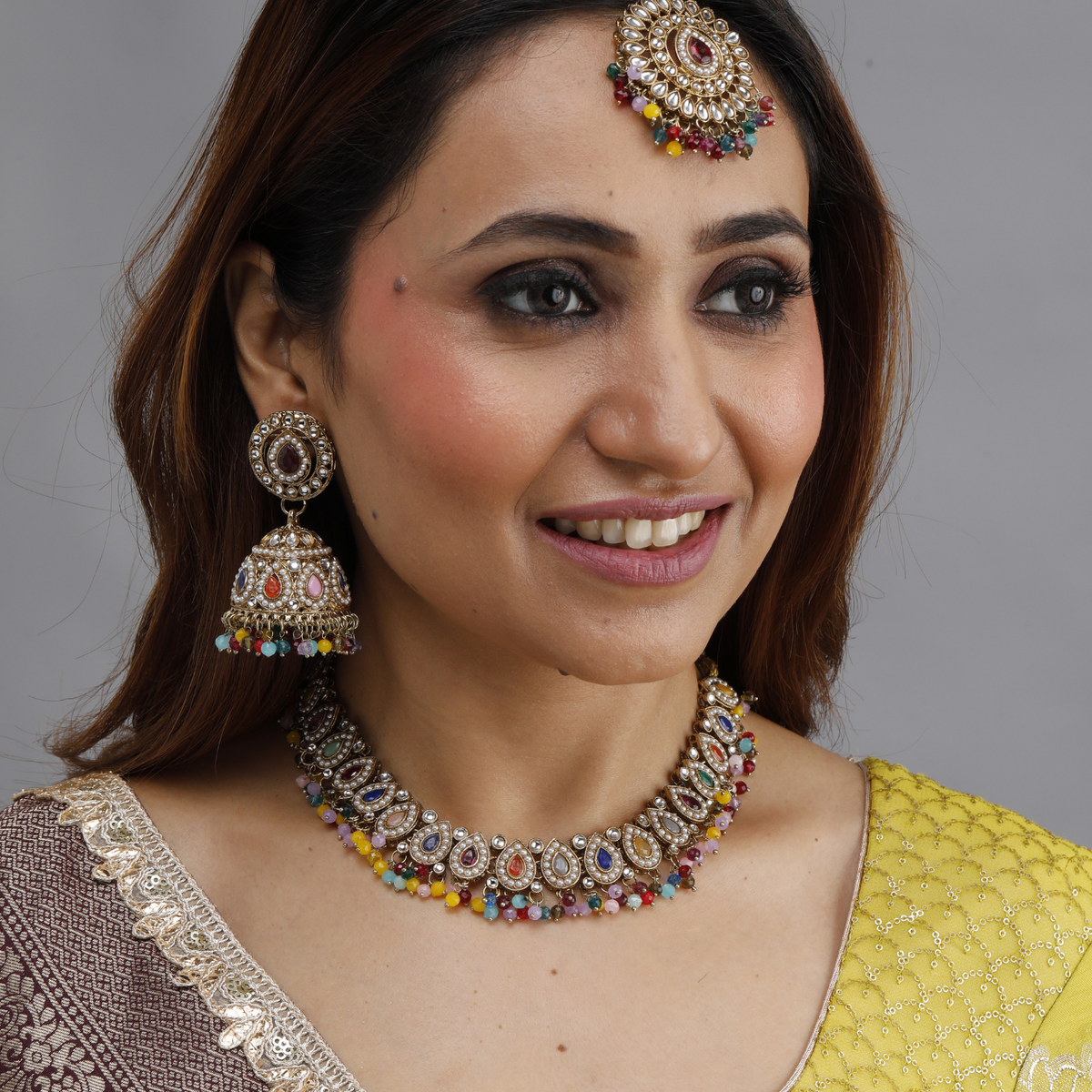 Whether you prefer the opulence of gold, the sophistication of silver, or the playful charm of multi-color, this set is designed to complement a variety of ethnic wear, including sarees, lehengas, and anarkalis.