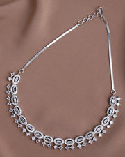 Elevate your style with our Shimmering Oval Necklace Set. This elegant piece features a stunning arrangement of oval-shaped American diamonds, meticulously set to create a dazzling display of light and sparkle.