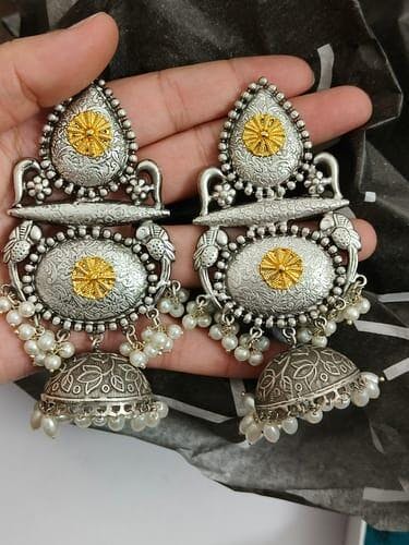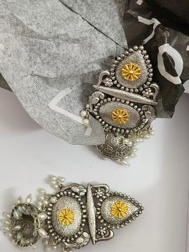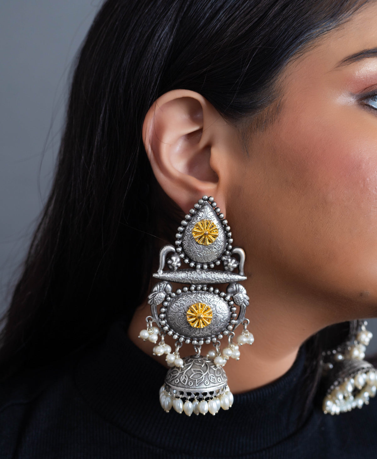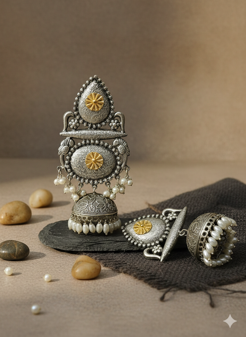 The elegant jhaale style, characterized by its cascading layers and delicate movement, is beautifully rendered in lustrous silver. Each earring is a testament to sophisticated craftsmanship, offering a timeless piece that drapes gracefully and catches the light with every turn. Perfect for special occasions or to elevate your everyday elegance, the SULTANA MUGHAL JHAALE EARRINGS are a luxurious addition to any jewelry collection, promising enduring beauty and a touch of royal charm.