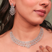 Channel timeless glamour with the Eira Frost CZ Bridal Choker Set, a stunningly crafted masterpiece designed to turn heads at every celebration. Encrusted with radiant cubic zirconia stones in an intricate swirl-and-drop pattern, this silver-toned choker set exudes regal elegance and contemporary charm.