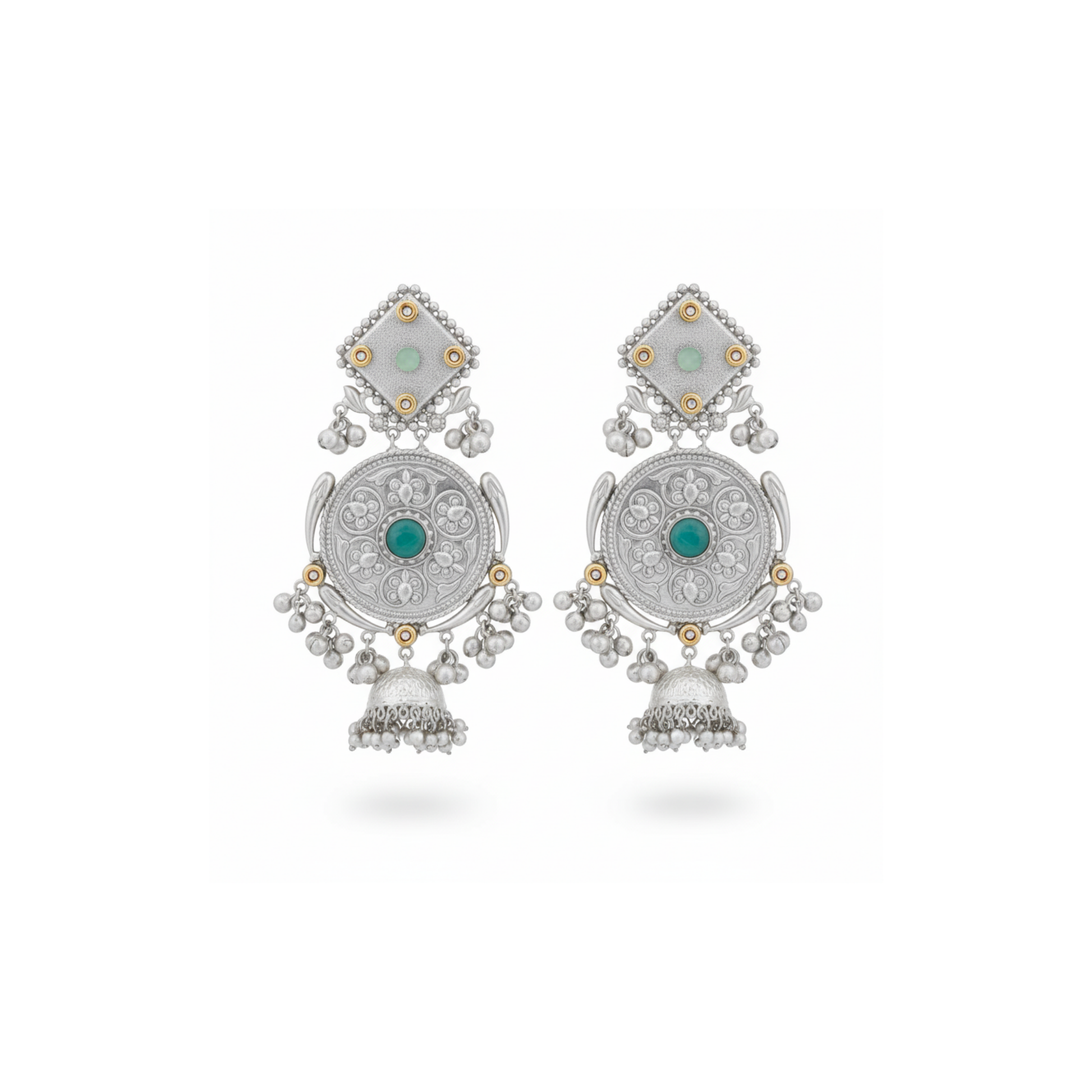 Step into a realm of royalty with our Empress Chandbalis, a stunning testament to timeless elegance and regal charm. Crafted from fine silver, these earrings feature an intricately detailed circular motif, highlighted by vivid emerald-green accents that exude sophistication. The design is completed with graceful pearl clusters and a traditional jhumka drop, creating a captivating fusion of tradition and opulence.