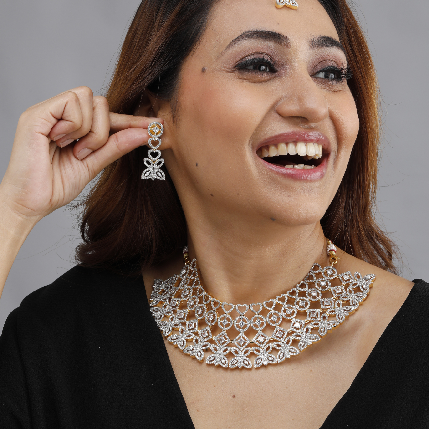The Diamond Lace Choker Set is a stunning blend of intricate design and luxury. This wide, lace-inspired choker is adorned with sparkling cubic zirconia, creating a dazzling look. Paired with matching earrings and a maang tikka, the set offers a perfect ensemble for brides or anyone seeking elegance.