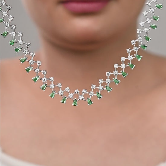 The Naira Emerald Cubic Zirconia Silver Set is the epitome of modern elegance. Crafted on a sterling silver base, it features emerald-green cubic zirconia stones accentuated with fine-quality CZ sparkle. With its sleek and minimalistic design, this set is perfect for those who love understated luxury. Ideal for evening gatherings, parties, and contemporary festive looks.