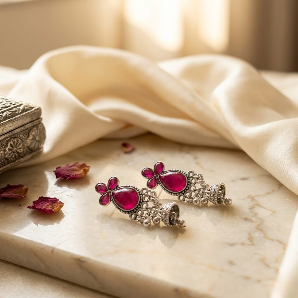 Turn heads with the timeless charm of these ruby pink stone oxidised silver jhumki earrings, crafted to bring a bold pop of color to your ethnic wardrobe. The design features a deep fuchsia teardrop stone centerpiece paired with a delicate floral top, beautifully framed in an antique silver border for that rich, vintage finish.