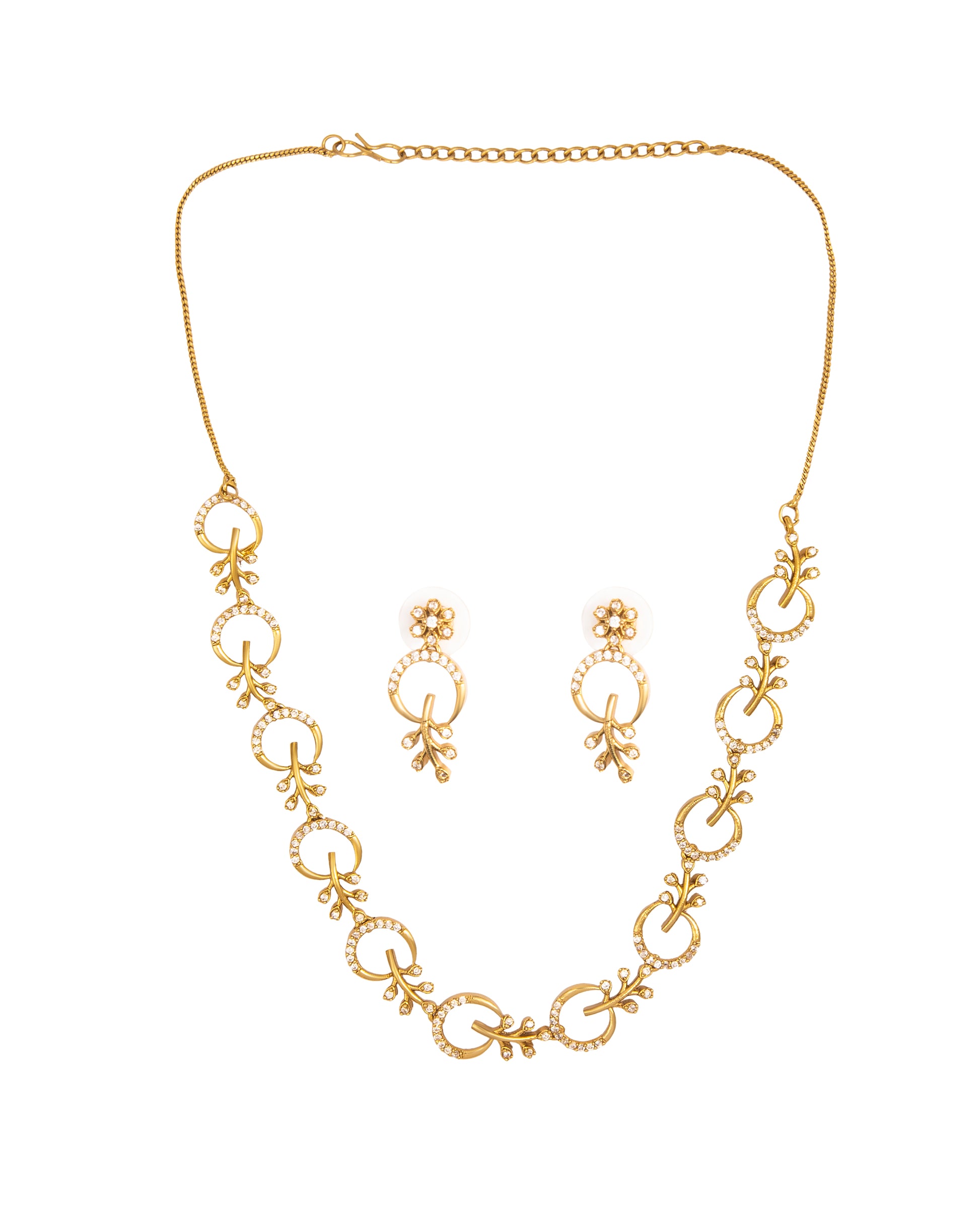 The Radhika AD Sleek Set is a graceful blend of tradition and modern minimalism. Crafted with a sterling silver base and finished in mehendi polish (dull gold tone), it is adorned with fine-quality American Diamonds (AD) that sparkle with diamond-like brilliance. With its sleek and lightweight design, this set is perfect for weddings, festive occasions, and elegant evening wear.