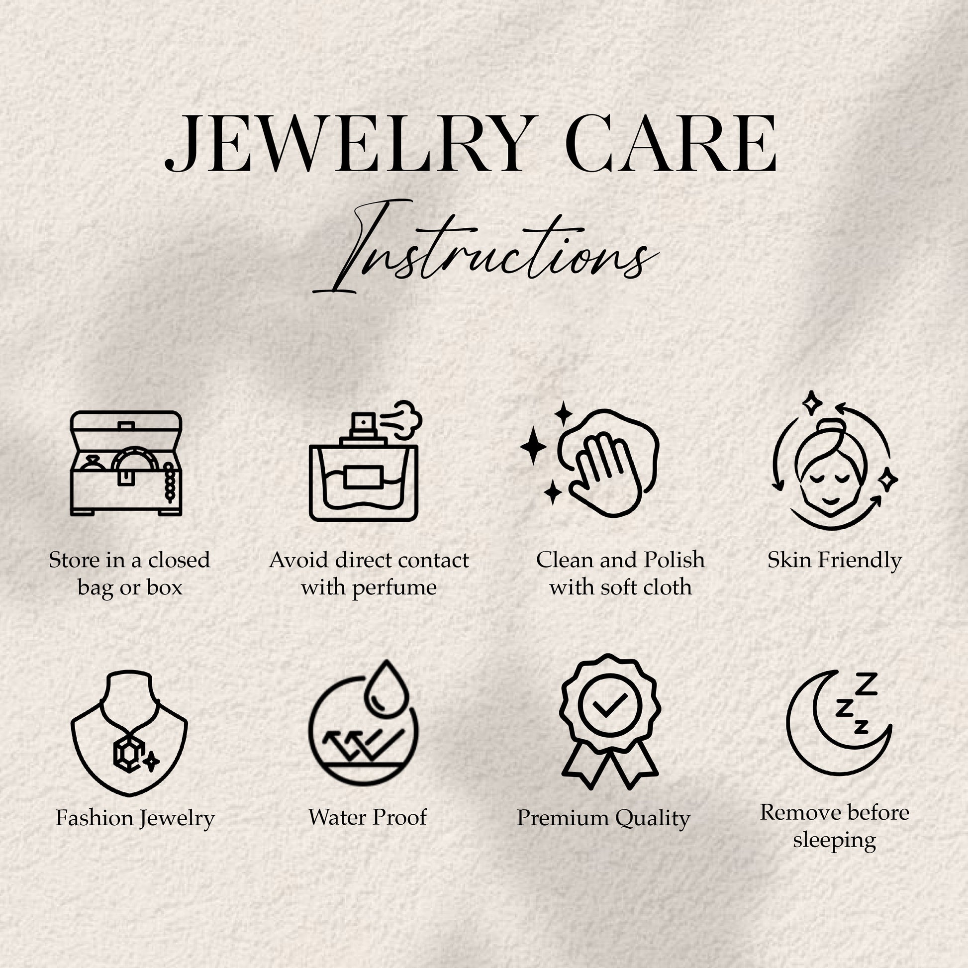 Store with care: Keep your jewellery in a zip lock bag when not wearing it. Avoid chemicals: Keep away from direct contact with perfumes, sanitisers, and harsh chemicals to maintain its shine and beauty.