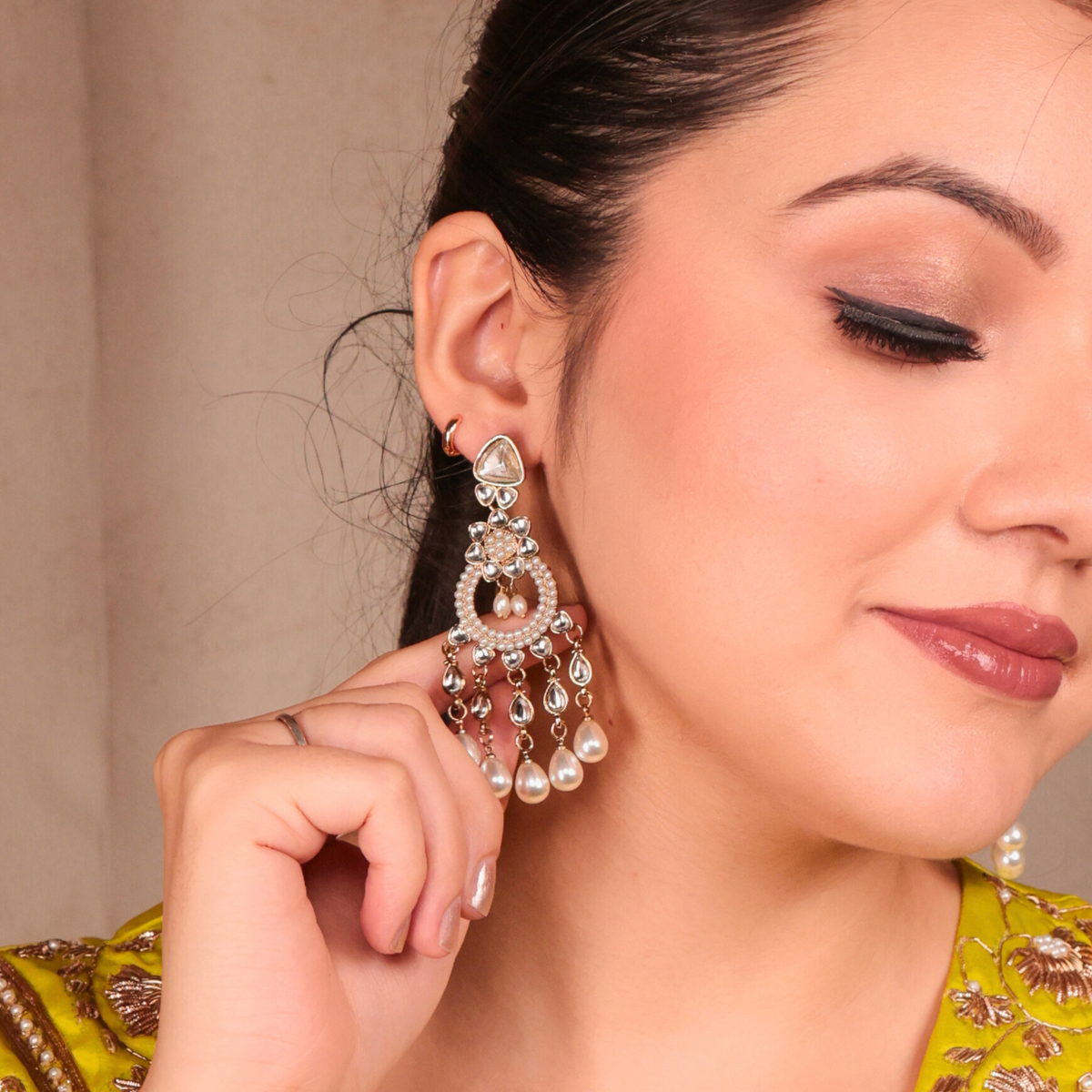 Elevate your ethnic elegance with Zoya Kundan Pearl Chandbalis, a timeless blend of tradition and charm. These stunning earrings are crafted in classic Kundan style, featuring intricate heart-shaped mirror work paired with rows of lustrous pearls. The grand chandelier design and dangling pearl drops create graceful movement, making them perfect for special occasions where you want to stand out.